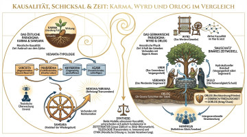 Das Radar-Diagramm abstrahiert die qualitativen Merkmale in messbare Dimensionen. Es visualisiert, dass Wyrd extrem in der Gegenwart verankert ist und auf dynamische Kausalität fokussiert, während Karma auf moralische Langzeit-Buchhaltung ausgerichtet ist.